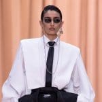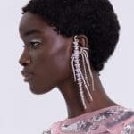 FENDI: iluminador glossy ou “efeito molhado”, sombra prateada em partículas maiores (glitter), ear cuff integrando a beleza e pouco blush ou contorno. A pele é feita nesse tipo de maquiagem apenas para correção sutil de tom, sem apagar sardas ou outras particularidades.