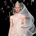 VALENTINO: Sobrancelhas descoloridas e maquiagem nude, com uma pegada bem futurista.