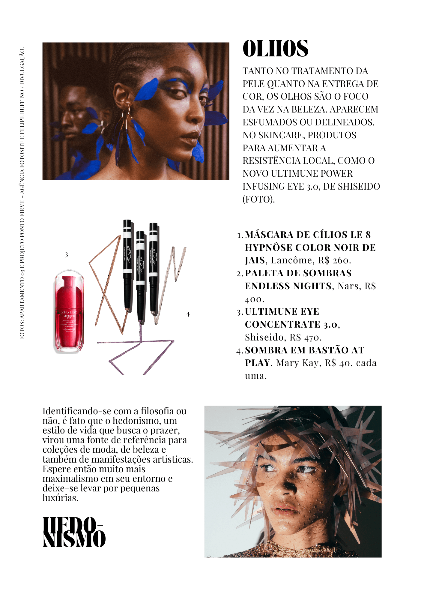 Na maquiagem e no skincare, os olhos estão em evidência. Muita sombra, delineador, mas também muito creme para amenizar bolsas, olheiras e aspecto de cansaço. Em comportamento, o hedonismo se faz cada dia mais presente.